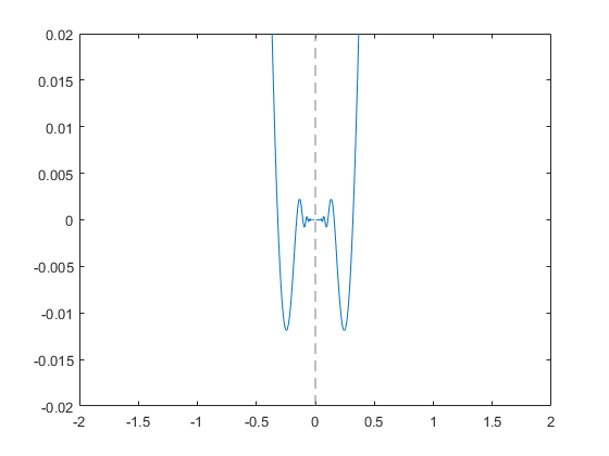 График x^3*sin(1/x) для -2 < x < 2 и -0.02 < y < 0.02. Увеличение масштаба графика с помощью zoom и перерисовать график с помощью drawnow. Из-за повторной оценки при увеличении, fplot раскрывает детали меньшего масштаба. Повторите зумирование 6 раз, чтобы просмотреть сведения меньшего масштаба. Чтобы воспроизвести анимацию, щелкните изображение.