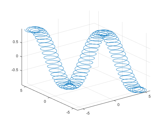 syms t xt = t; yt = t/2; zt = sin(6*t); fplot3(xt,yt,zt,[-2*pi 2*pi],'MeshDensity',30) view(52.5,30) xlabel('x') ylabel('y') title('x=t, y=t/2, z=sin(6t) for -2\pi < t < 2\pi') ax = gca; S = sym(ax.XLim(1):pi/2:ax.XLim(2)); ax.XTick = double(S); ax.XTickLabel = arrayfun(@texlabel, S, 'UniformOutput', false); S = sym(ax.YLim(1):pi/2:ax.YLim(2)); ax.YTick = double(S); ax.YTickLabel = arrayfun(@texlabel, S, 'UniformOutput', false);