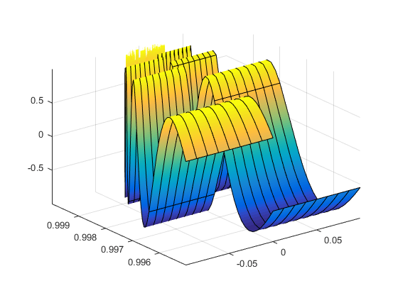 syms s t h = fsurf(t.*sin(s), cos(s), sin(1./s), [-0.1 0.1 0 1]); h.MeshDensity = 9; for i=1:0.05:3 h.ZFunction = sin(i./s); drawnow end