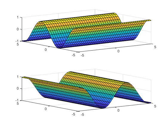 syms x y; f(x,y) = sin(y); figure; subplot(2,1,1) fsurf(f); subplot(2,1,2) fsurf(f(x,y)); % Or fsurf(sin(y));
