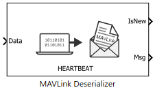 На каждом этапе моделирования блок декодирует входной сигнал. uint8 и извлекает сообщения MAVLink, которые принимаются после декодирования. Если было принято новое сообщение для выбранного типа сообщения MAVLink, блок извлекает это сообщение из списка принятых сообщений и преобразует его в немиртуальный сигнал шины Simulink.