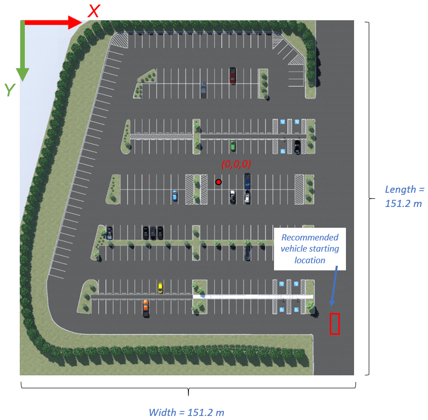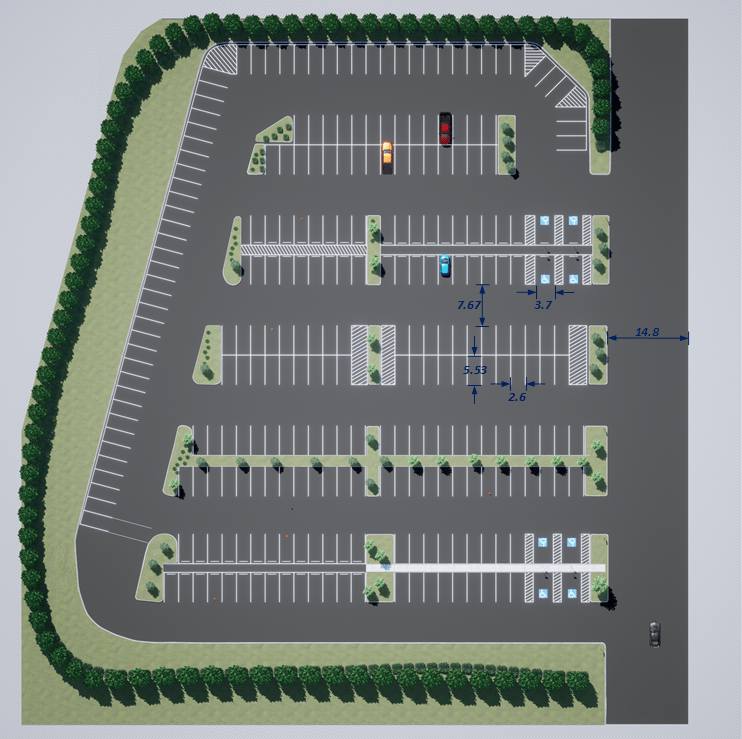 Сцена большой парковки - это 3D среда большой парковки, которая содержит конусы, бордюры, дорожные знаки и припаркованные транспортные средства. Сцена визуализируется с помощью Unreal Engine ® из Epic Games ®.