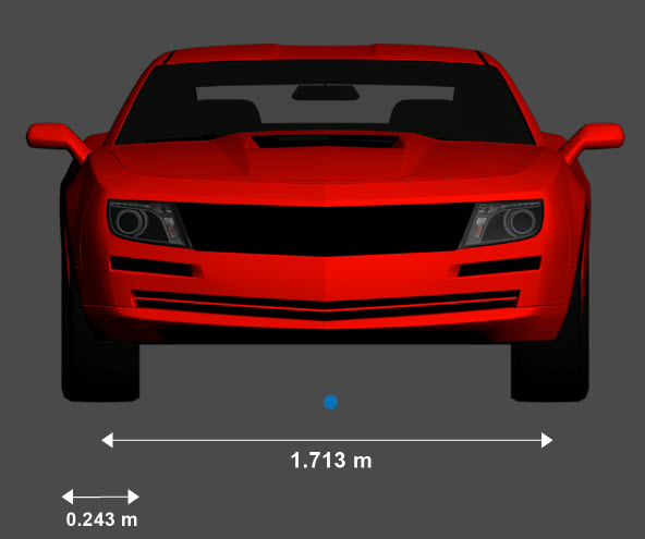 Muscle Car является одним из транспортных средств, которые можно использовать в среде моделирования 3D. Эта среда визуализируется с помощью Unreal Engine ® от Epic Games ®. На следующей диаграмме представлены размеры данного транспортного средства. Размеры по высоте соответствуют вертикальной плоскости грунта. Размеры длины и ширины соответствуют исходной точке транспортного средства в системе координат транспортного средства. Начало координат - на земле, в геометрическом центре транспортного средства. Для получения более подробной информации об этих схемах см. раздел «Размеры».