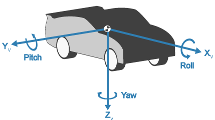 Оси системы координат транспортного средства (XV, YV, ZV) закреплены в опорной раме, прикрепленной к транспортному средству. Исходная точка находится у подрессоренной массы транспортного средства.