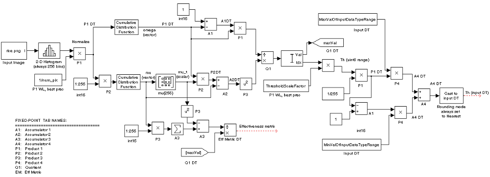 На следующей схеме показаны типы данных, используемые в блоке Autothreshold для сигналов с фиксированной точкой. Можно использовать параметры фиксированной точки по умолчанию, если длина слова меньше или равна 16.