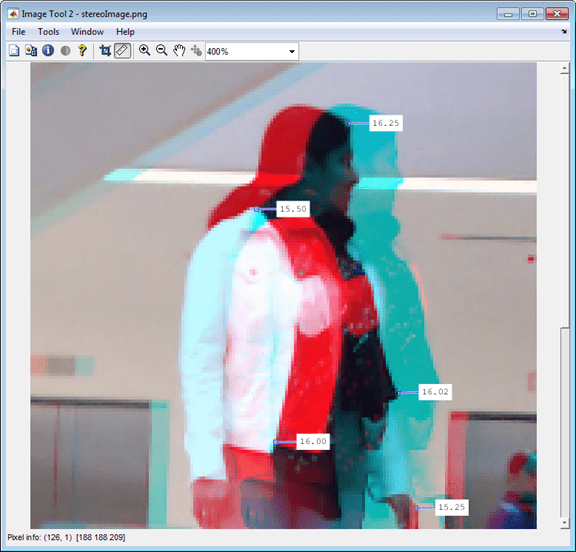 Если результирующая карта несоответствия выглядит шумно, попробуйте изменить DisparityRange. Диапазон различий зависит от расстояния между двумя камерами и расстояния между камерами и интересующим объектом. Увеличить DisparityRange когда камеры находятся далеко друг от друга или объекты находятся близко к камерам. Чтобы определить разумное несоответствие конфигурации, отобразите стереоанаглиф входных изображений в imtool и используйте инструмент «Расстояние» для измерения расстояний между парами соответствующих точек. Измените значение MaxDisparitity, чтобы оно соответствовало измерению.