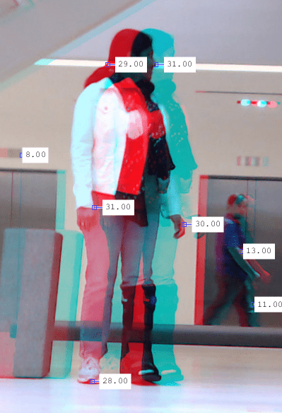 Например, этот рисунок отображает стереоанаглиф выпрямленного изображения стереопары и значения горизонтального сдвига, измеренные между соответствующими точками в изображении стереопары. Минимальное и максимальное значения сдвига вычисляются как 8 и 31 соответственно. На основе этих значений диапазон различий может быть выбран как [0, 48].