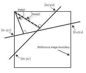На следующем рисунке показана линия 1, пересекающая границы опорного изображения в [(x11, y11) (x12, y12)] и Линия 2, пересекающая границы в [(x21, y21) (x22, y22)]