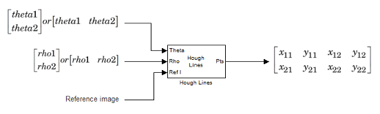 Блок Houf Lines находит точки пересечения между граничными линиями опорного изображения и линией, заданной парой (rho, theta). Блок выводит одноосновные координаты [x y] для точек пересечения. Граничные линии указывают левую и правую вертикальные границы, а также верхнюю и нижнюю горизонтальные границы опорного изображения.
