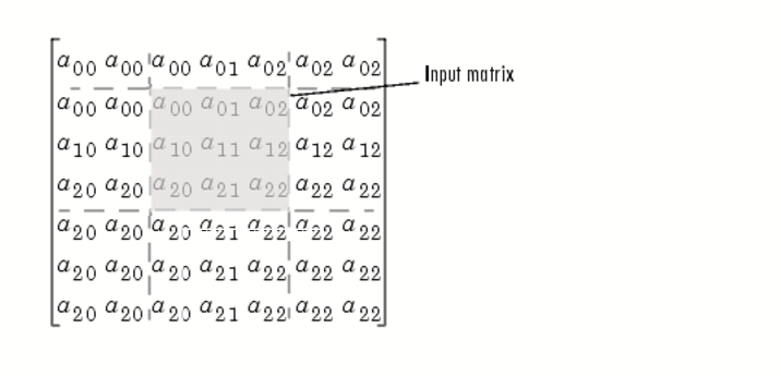 Граничные значения входного сигнала копируются сверху, снизу, слева и справа от входного сигнала, так что выходной сигнал является матрицей 7 на 7. Значения в углах этой выходной матрицы определяются путем тиражирования граничных значений матриц на верхней, нижней, левой и правой сторонах исходного входного сигнала.
