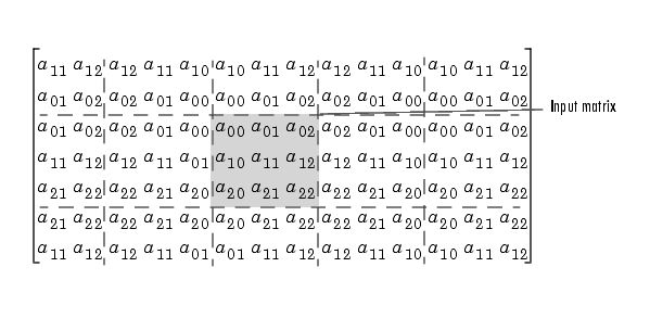 Блок разворачивает исходную входную матрицу и каждую создаваемую им матрицу вокруг их верхней, нижней, левой и правой сторон для заполнения выходного сигнала 7 на 13. Например, на предыдущем рисунке показано, как блок разворачивает входную матрицу относительно ее правой стороны, чтобы создать матрицу непосредственно справа от нее.