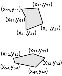 Для одной или нескольких полилиний или многоугольников с одинаковым числом вершин укажите M-by-2L матрицу, где каждая строка является вектором последовательных расположений вершин, представляющим полилинию или многоугольник с L числом вершин. | Два многоугольника с равным числом вершин, M = 2, L = 5