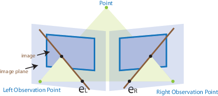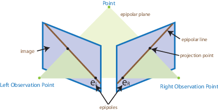 Если плоскости изображения расположены под более тонким углом друг к другу, можно ожидать, что эпипол будет расположен вне изображения (но все же в плоскости изображения).