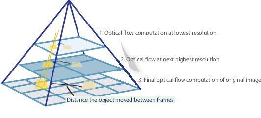 Отслеживание начинается на самом низком уровне разрешения и продолжается до сходимости. Местоположения точек, обнаруженные на уровне, распространяются как ключевые точки для последующего уровня. Таким образом, алгоритм уточняет отслеживание с каждым уровнем. Разложение пирамиды позволяет алгоритму обрабатывать движения больших пикселей, которые могут быть на расстоянии, превышающем размер окрестности.