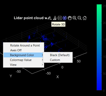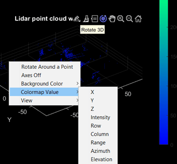 | Значение карты цветов | Щелкните Повернуть (Rotate), а затем щелкните правой кнопкой мыши на рисунке для выбора параметров карты цветов. Можно изменить значения цветовой карты для доступных значений координат и диапазона в зависимости от типа отображаемого облака точек.