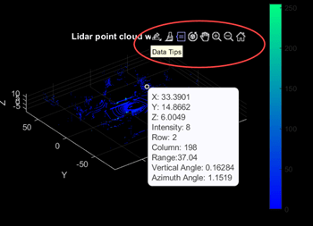 | Datatip | Нажмите «Подсказки по данным» для просмотра значений точек данных для любой точки фигуры облака точек. Для обычного облака точек в подсказках по данным отображаются значения x, y, z. Дополнительные свойства данных для изображения глубины и лидара: