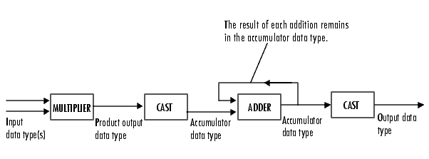 Как показано на предыдущей диаграмме, входы в аккумулятор подаются на тип данных аккумулятора. Выходной сигнал сумматора остается в типе данных накопителя при добавлении к нему каждого элемента входного сигнала. Используйте этот параметр, чтобы указать, как обозначать длины слов и дробей в накопителе.