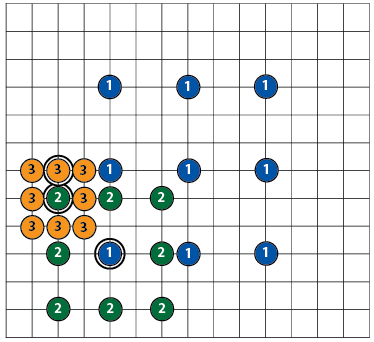 На каждом новом шаге блок перемещает центр поиска в наилучшую точку соответствия, полученную на предыдущем шаге. Синие круги номер один на рисунке ниже представляют поиск с размером начального шага три. Число два зеленых круга представляет следующий поиск с размером шага два, центрированный вокруг наилучшего совпадения, найденного в предыдущем поиске. Наконец, число три оранжевых круга представляют окончательный поиск с размером шага один, центрированный вокруг предыдущего наилучшего совпадения.