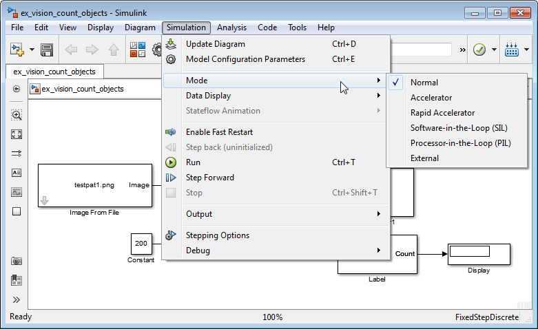 Предложение программного обеспечения Simulink Accelerator и Rapid Accelerator режимы моделирования, которые устраняют большую часть вычислительных затрат, требуемых моделями Simulink. Эти режимы компилируют целевой код модели. Благодаря этому методу среда Simulink может значительно повысить производительность более крупных моделей. Прирост производительности зависит от размера и сложности модели. Поэтому большие модели, содержащие блоки Computer Vision Toolbox™, работают быстрее в Rapid Accelerator или Accelerator режим.