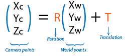 Внешние параметры состоят из поворота, R и перемещения, т. Начало системы координат камеры находится в ее оптическом центре, а ее оси x и y определяют плоскость изображения.