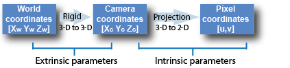 Для модели камеры «рыбий глаз» внутренние параметры включают коэффициенты полиномиального отображения проекционной функции. Коэффициенты выравнивания связаны с выравниванием датчика и преобразованием из плоскости датчика в положение пикселя в плоскости изображения камеры.