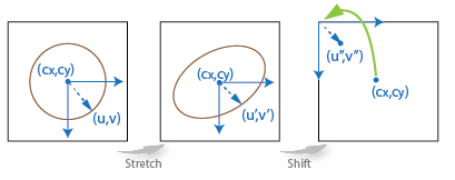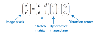 Следующее уравнение связывает реальные искаженные координаты (u «, v») с идеальными искаженными координатами (u, v).