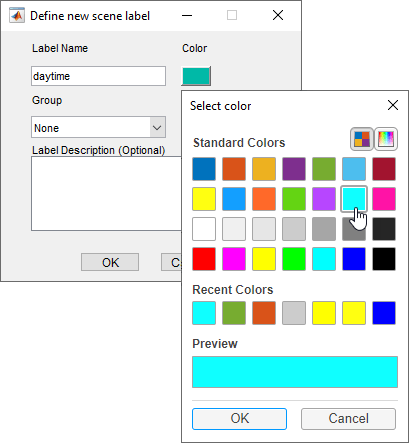 Измените цвет определения метки на светло-синий, чтобы отразить характер метки сцены. Под параметром Цвет (Color) щелкните предварительный просмотр цвета и выберите стандартные светло-синие цвета. Затем нажмите кнопку ОК, чтобы закрыть окно выбора цвета.