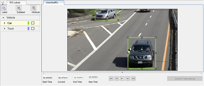 В этом примере определяется vehicle группа для маркировки типов транспортных средств, а затем создать два Rectangle наклейки окупаемости инвестиций, Car и Truck. После создания меток можно использовать раскрывающееся меню Показать метки ROI (Show ROI Labels), чтобы выбрать пункты При наведении (On Hover), Всегда (Always) или Никогда (Never), чтобы управлять отображением имен меток ROI во время создания меток. По умолчанию имена отображаются при наведении курсора на ROI.