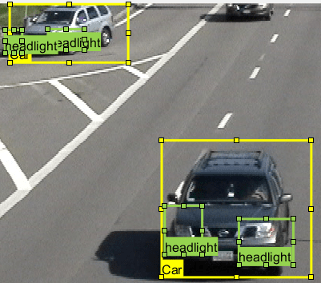 Выберите метки, которые требуется автоматизировать. В первом кадре видео нажмите Ctrl и щелкните для выбора двух аннотаций меток автомобиля. Метки выделены желтым цветом.