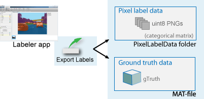 При создании и экспорте меток пикселей из приложений Image Labeler, Video Labeler или Ground Truth Labeler (Automated Driving Toolbox) (требуется Automated Driving Toolbox™) сохраняются два набора данных.