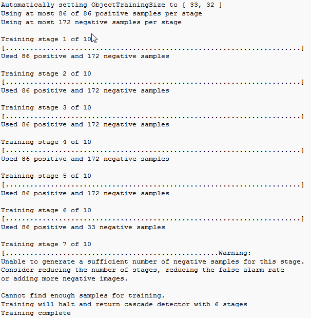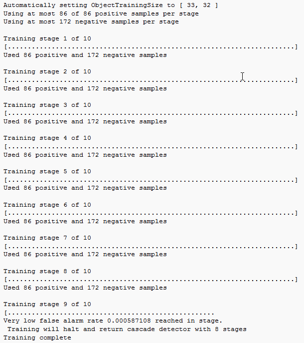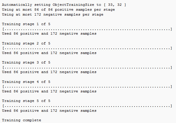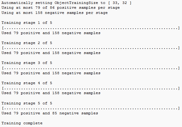 Automatically setting ObjectTrainingSize to [35, 32] Using at most 42 of 42 positive samples per stage Using at most 84 negative samples per stage --cascadeParams-- Training stage 1 of 5 [........................................................................] Used 42 positive and 84 negative samples Time to train stage 1: 0 seconds Training stage 2 of 5 [........................................................................] Used 42 positive and 84 negative samples Time to train stage 2: 0 seconds Training stage 3 of 5 [........................................................................] Used 42 positive and 84 negative samples Time to train stage 3: 2 seconds Training stage 4 of 5 [........................................................................] Used 42 positive and 84 negative samples Time to train stage 4: 6 seconds Training stage 5 of 5 [........................................................................] Used 42 positive and 17 negative samples Time to train stage 5: 9 seconds Training complete