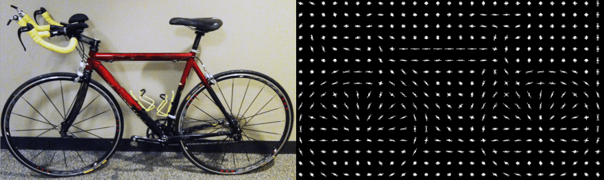Выберите функцию, подходящую для требуемого типа обнаружения объектов. trainCascadeObjectDetector поддерживает три типа функций: Haar, локальные двоичные шаблоны (LBP) и гистограммы ориентированных градиентов (HOG). Функции Haar и LBP часто используются для обнаружения лиц, поскольку они хорошо работают для представления тонких текстур. Функции HOG часто используются для обнаружения таких объектов, как люди и автомобили. Они полезны для захвата общей формы объекта. Например, в следующей визуализации элементов HOG можно увидеть контур велосипеда.