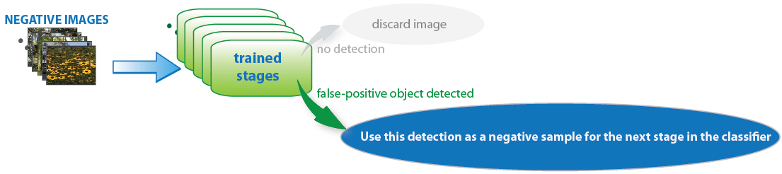Отрицательные выборки явно не указаны. Вместо этого, trainCascadeObjectDetector функция автоматически генерирует отрицательные выборки из предоставленных пользователем отрицательных изображений, не содержащих интересующих объектов. Перед тренировкой каждого нового этапа функция запускает детектор, состоящий из этапов, уже обученных на отрицательных изображениях. Любые обнаруженные из этого изображения объекты являются ложными положительными, которые используются в качестве отрицательных выборок. Таким образом, каждый новый этап каскада обучается исправлению ошибок, допущенных предыдущими этапами.