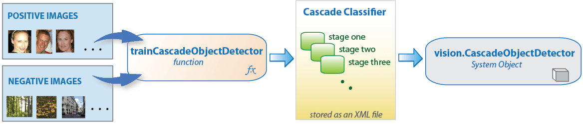 vision.CascadeObjectDetector Объект системы снабжен несколькими предварительно подготовленными классификаторами для обнаружения фронтальных граней, фасадов профиля, носов, глаз и верхней части тела. Однако этих классификаторов не всегда достаточно для конкретного применения. Компьютерное зрение Toolbox™ обеспечивает trainCascadeObjectDetector для обучения пользовательского классификатора.