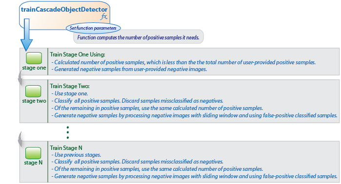trainCascadeObjectDetector функция автоматически определяет количество положительных выборок, используемых для обучения каждого этапа. Количество основано на общем количестве положительных выборок, предоставленных пользователем, и значениях TruePositiveRate и NumCascadeStages параметры.