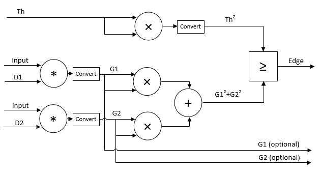 Блок «Детектор краев» находит края в потоке пикселов в градациях серого с помощью методов Собеля, Превитта или Робертса. Блок свертывает входные пиксели матрицами аппроксимации производных, чтобы найти градиент величины пикселя вдоль двух ортогональных направлений. Затем он сравнивает сумму квадратов градиентов с квадратом конфигурируемого порога, чтобы определить, представляют ли градиенты ребро.