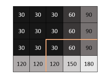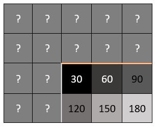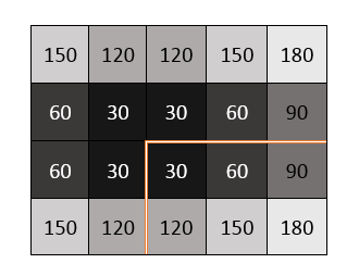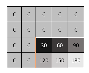 На диаграммах показан верхний левый угол кадра с добавленным заполнением для размещения ядра фильтра 5 на 5. При вычислении отфильтрованного значения для верхнего левого активного пикселя алгоритм требует двух строк и двух столбцов заполнения. Край активного изображения обозначается двойной линией.