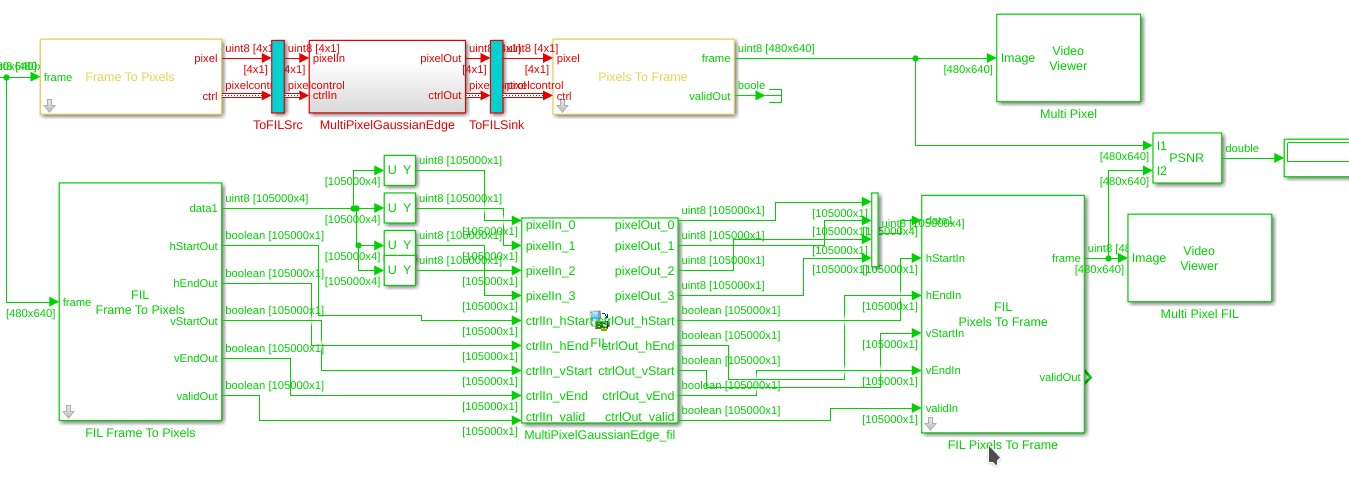 Эти изменения кода устраняют пиксельную проверку результатов FIL относительно результатов MATLAB. При необходимости можно добавить цикл пикселей для вызова опорной функции и покадровое сравнение результатов. Однако вызов исходной функции для привязки замедляет моделирование.