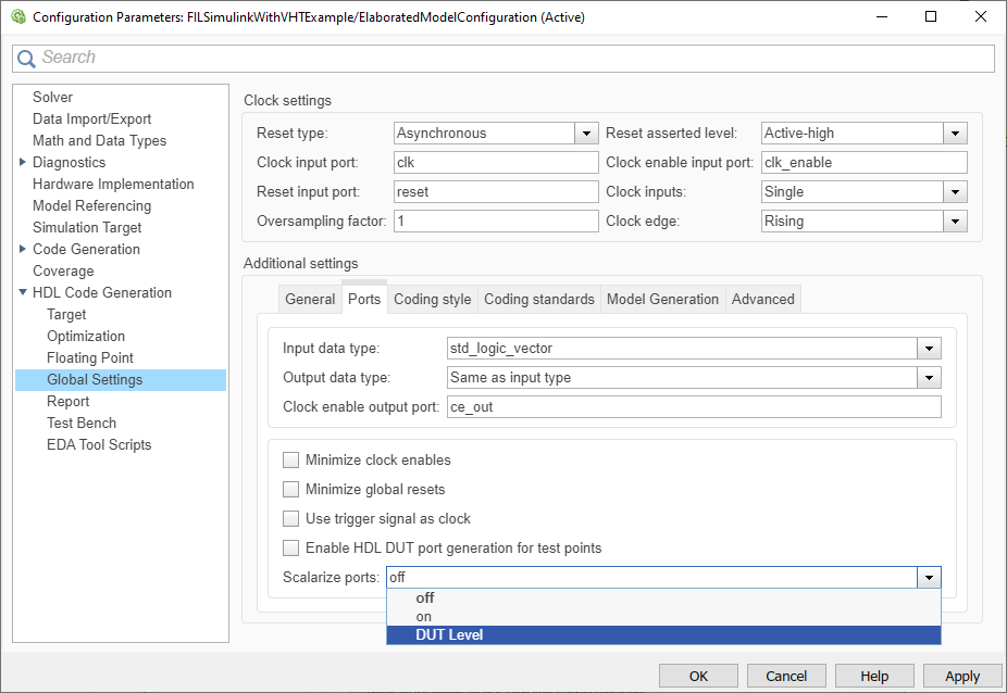 Для генерации кода VHDL в меню «Параметры конфигурации» > «Создание кода HDL» > «Глобальные настройки» > «Порты» задайте для параметра Scalarize ports значение DUT Level.