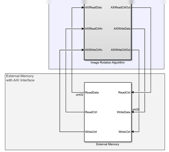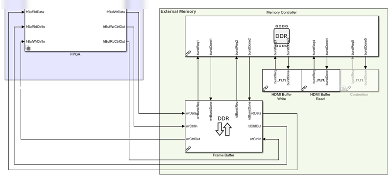 Можно моделировать внешнюю память с помощью функций из пакета поддержки Vision HDL Toolbox™ для аппаратных средств на базе Xilinx ® Zynq ® или SoC Blockset™. Оба продукта обеспечивают модели для буфера кадров или интерфейса произвольного доступа. Они также сопоставляют порты подсистемы с физическими интерфейсами памяти AXI при создании кода HDL и назначении платы-прототипа.