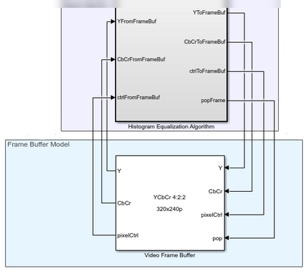 | На этом рисунке показана часть примера выравнивания гистограммы с использованием буфера видеокадров (SoC Blockset). В примере показано, как использовать блоки библиотеки каналов памяти и контроллеров памяти для моделирования буфера кадров и дополнительных потребителей памяти. Эту модель можно использовать для подтверждения того, что интерфейс памяти соответствует требованиям к пропускной способности и задержкам в конструкции. Можно измерить пропускную способность и задержку транзакций для каждого потребителя памяти и проверить измерения по общей пропускной способности, доступной из памяти. Чтобы смоделировать буфер кадров, поддерживающий потоковый интерфейс пикселей, используемый блоками панели инструментов Vision HDL, настройте параметр Channel type блока Memory Channel как