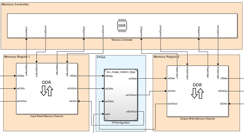 На этом рисунке показана часть примера ротации изображения с аппаратным обеспечением на основе Zynq (пакет поддержки панели инструментов Vision HDL для аппаратного обеспечения на основе Xilinx Zynq). Блок внешней памяти выполняет чтение и запись на любой адрес в памяти. В этом случае вместо подключения потока пикселей к интерфейсу памяти пользовательская логика FPGA должна генерировать транзакции чтения и записи с определенными адресами. Чтобы использовать этот блок в проектах, скопируйте его из примера модели.