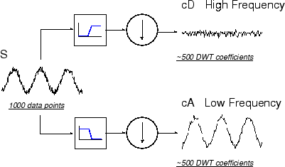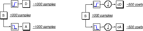 Эти сигналы A и D интересны, но мы получаем 2000 значений вместо 1000, которые у нас были. Существует более тонкий способ выполнения разложения с использованием вейвлетов. Внимательно глядя на вычисления, мы можем сохранить только одну точку из двух в каждой из двух выборок длиной 2000, чтобы получить полную информацию. Это понятие понижающей дискретизации. Мы производим две последовательности, называемые cA и cD.