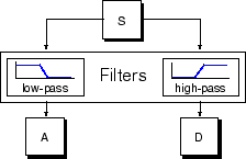 Эффективный способ реализации этой схемы с использованием фильтров был разработан в 1988 году Маллатом (см. [Mal89] в Справочнике). Алгоритм Маллата фактически является классической схемой, известной в сообществе обработки сигналов как двухканальный поддиапазонный кодер (см. стр. 1 книги Wavelets and Filter Banks, by Strang and Nguyen [StrN96]).