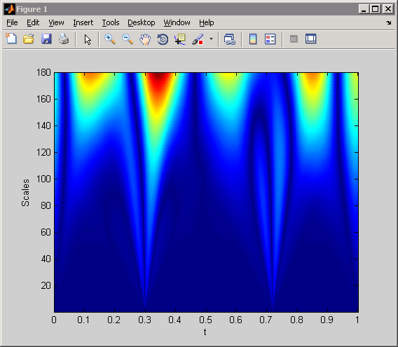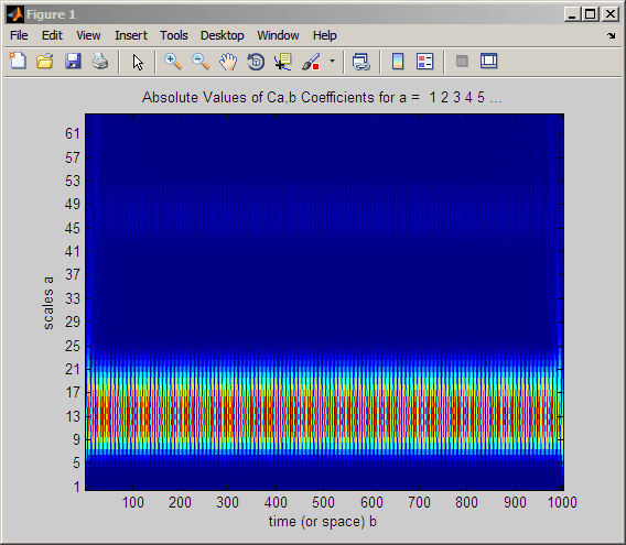 t = linspace(0,1,1000); x = cos(2*pi*60*t); CWTcoeffs = cwt(x,1:64,'sym8','plot'); colormap jet;