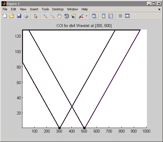 Следующий пример характеризует суперпозицию двух сдвинутых импульсов, t − 500). В этом случае используйте экстремальный фазовый вейвлет Daubechies с четырьмя моментами исчезновения ,db4. На следующем рисунке показан конус воздействия для точек 300 и 500 с использованием db4 вейвлет.