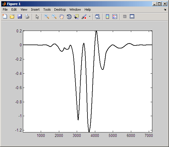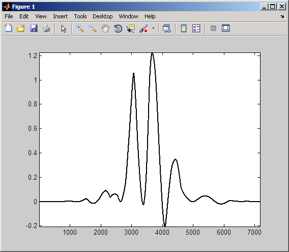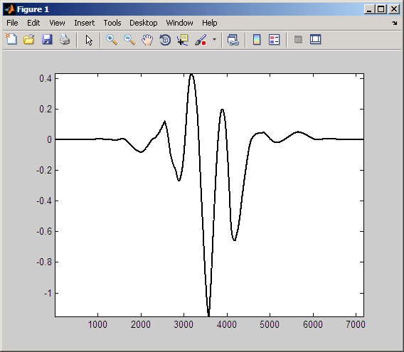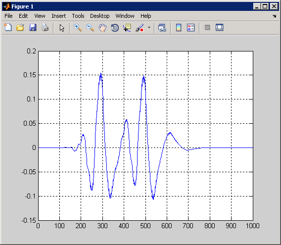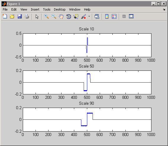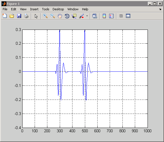 x = zeros(1000,1); x([300 500]) = 1; CWTcoeffs = cwt(x,1:128,'db4'); plot(CWTcoeffs(20,:)); grid on;