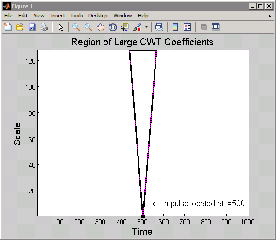 Эта область называется конусом влияния точки t = 500 для импульса Хаара. Для данной точки конус влияния показывает, на какие коэффициенты CWT влияет значение сигнала в этой точке.