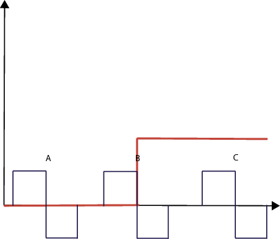 В положении В вейвлет Хаара уже сдвинулся в ненулевую часть ступенчатой функции на 1/2 ее опоры. Как только поддержка вейвлета пересекается с единичной частью ступенчатой функции, коэффициенты CWT являются ненулевыми. Фактически, ситуация, показанная на предыдущем рисунке, совпадает с тем, что коэффициенты CWT достигают своего наибольшего абсолютного значения. Это происходит потому, что весь отрицательный прогиб вейвлет-колебания перекрывается с единичной частью единичного шага, в то время как ни один из положительных прогибов вейвлета не происходит. Как только импульс сдвигается до такой степени, что положительное отклонение перекрывается с единичным шагом, будет некоторый положительный вклад в интеграл. Вейвлет-коэффициенты все еще отрицательные (отрицательная часть интеграла больше по площади), но они меньше по абсолютной величине, чем полученные в положении В.