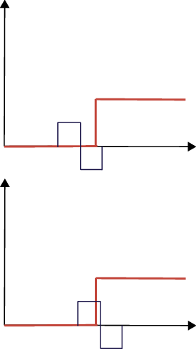 На верхней фигуре вейвлет только начал перекрываться с единичной частью единичного шага. В этом случае коэффициенты CWT являются отрицательными, но не такими большими в абсолютном значении, как те, которые получены в положении В. На нижнем чертеже вейвлет сдвинулся за положение В, и положительное отклонение вейвлета начинает вносить вклад в интеграл. Коэффициенты CWT все еще являются отрицательными, но не такими большими в абсолютном значении, как те, которые получены в положении B.